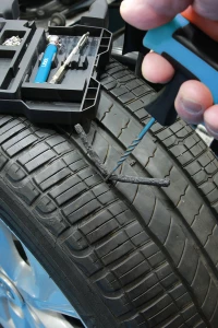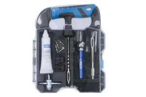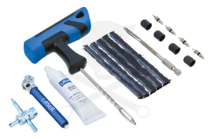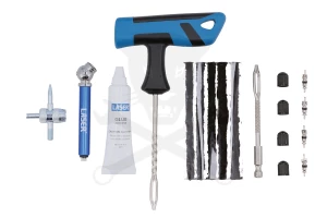 Átfogó, kötél alakú, vészhelyzeti gumiabroncs-javító készlet, amely kézi és fúró-csavarozó adaptereket is tartalmaz.