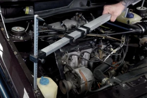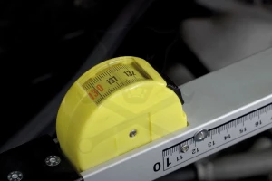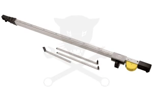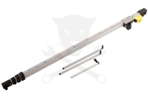 Alumínium teleszkópos mérőeszköz beépített mérőszalaggal és három állítható mutatóval a jármű tengelytávjának és alvázbeállításának ellenőrzéséhez.