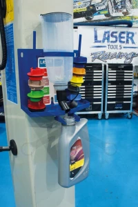 - A Laser Tools olajleeresztő állomással (cikkszám: LAS-9113) szállítjuk, amely biztosítja, hogy a tölcsérkészlet alkatrészeiből a felesleges olaj szabályozott módon egy üres, szabványos 1 literes olajospalackba folyjon (nem tartozék).
