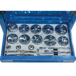 Tartalmaz továbbá három tárolófiókot, amiből a két felső fiók 61 darabos olajszűrő-kulcskészlettel és leeresztőkulcsokkal, extra minőségű olajszűrő leszedő kupakokkal habszivacs tálcákban van teljesen feltöltve.