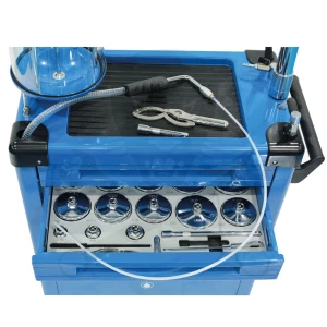 Teljesen felszerelt mobil olaj cserélő áállomás, amely egy hagyományos, magasságban állítható gravitációs leeresztő tölcsért (1,6–1,9 m), vákuumos leeresztő garatot és fáradtolaj-tartályt egyesít egy szabadon álló, teljesen mobil állomásban.