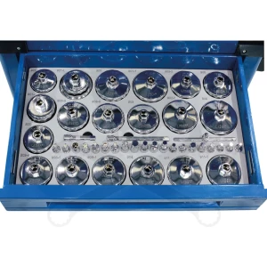 - 61 részes olajszűrő-kulcs és leeresztőkulcs készlettel együtt szállítjuk (A felső két fiók tartalma)