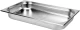 Rozsdamentes acél edény lekerekített sarkokkal és sima peremekkel, amelyek megkönnyítik a tisztítást.