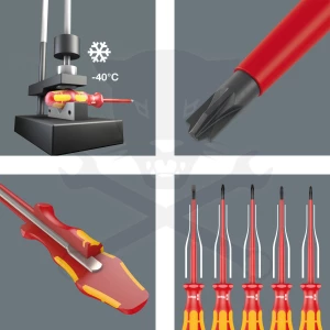 - VDE minősítés: minden egyes szerszám darabonként tesztelve 10.000 V feszültséggel, a biztonságos munkavégzéshez 1.000 V-ig hitelesítve.