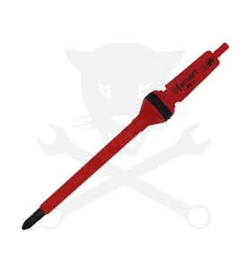 FELO E-SMART szigetelt csavarhúzó penge. A kupak eltávolítása után behelyezhető az E-SMART markolatba így normál szigetelt csavarhúzóként használható. Alkalmazható: pozidrive típusú, általában facsavarokhoz. A csavarhúzó 1000 voltig használható. Minden darab 10.000 volttal tesztelt, megfelel az EN60900 szabványnak. Méretei: PZ1, penge hossza: 80 mm. Penge Anyaga: króm-molibdén-vanádium acél ötvözet. Felületkezelés: szigetelt, hegy bevonat nélküli a pontos illeszkedés érdekében.
