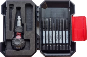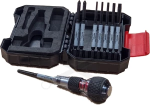 A bitek 100 mm hosszúak, így mélyebben ülő csavarokhoz is használhatók, és 1/4" hex meghajtással akár ütvecsavarozóba is befoghatók.