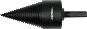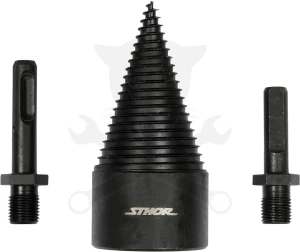 Háztartási tűzifa gyors előhasításához tervezett kúp alakú fahasító fúró. A készlet 1 db 45 mm átmérőjű, 95 mm hosszú kúpos fúrót és 2 db befogót tartalmaz (SDS-Plus és háromlapú/triangular szár), így többféle fúrógéppel is használható. A kúp edzett, feketített szénacélból készül, a befogók 40Cr acélból készültek, ami jó kopásállóságot és tartósságot ad. Alkalmazás: száraz, repedésre hajlamosabb faanyagok (rőzse, kisebb hasábok, vastagabb ágak, oszlopok) szétválasztása előhasítási műveletben.