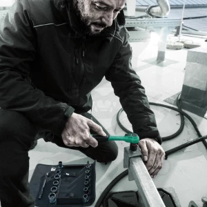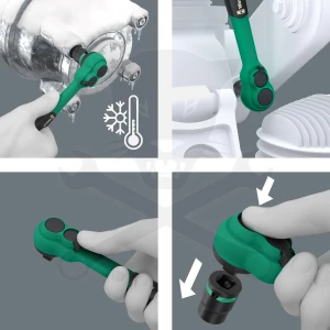 - Komfortos kialakítású racsni puha kétkomponensű markolattal, amely hidegben is kényelmes, és védi a szerelvényeket a sérülésektől.