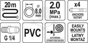 Pneumatikus tömlő 20 méter hosszúságú automata tömlődobon. Alkalmas pneumatikus szerszámokhoz. Hasznos minden műhelyben és gyártóüzemben.
