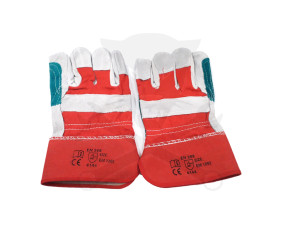 Munkáskesztyű, hasított tehénbőrből és piros pamut szövetből.